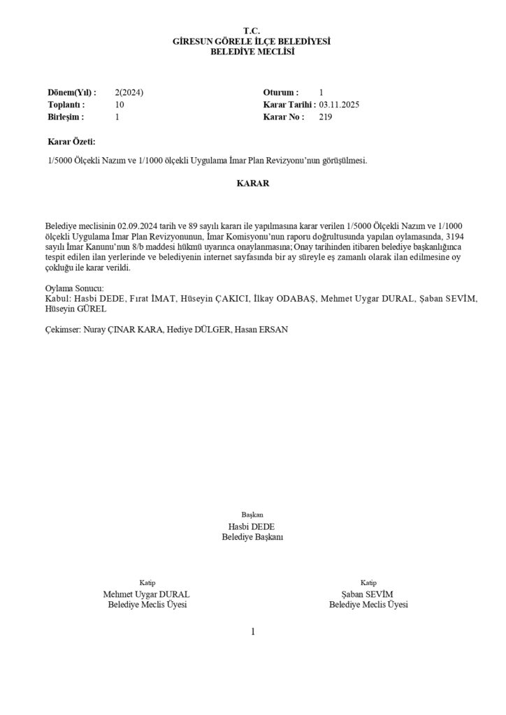 1/5000 Ölçekli Nazım ve 1/1000 Ölçekli Uygulama İmar Plan Revizyonunun Görüşülmesi