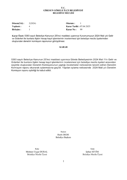 5393 sayılı Belediye Kanunun 25’inci maddesi uyarınca Kurumumuzun 2024 Mali yılı Gelir ve Giderleri ile bunlara ilişkin hesap kayıt işlemlerinin incelenmesi için belediye meclis üyelerinden oluşturulan denetim komisyon raporunun görüşülmesi.