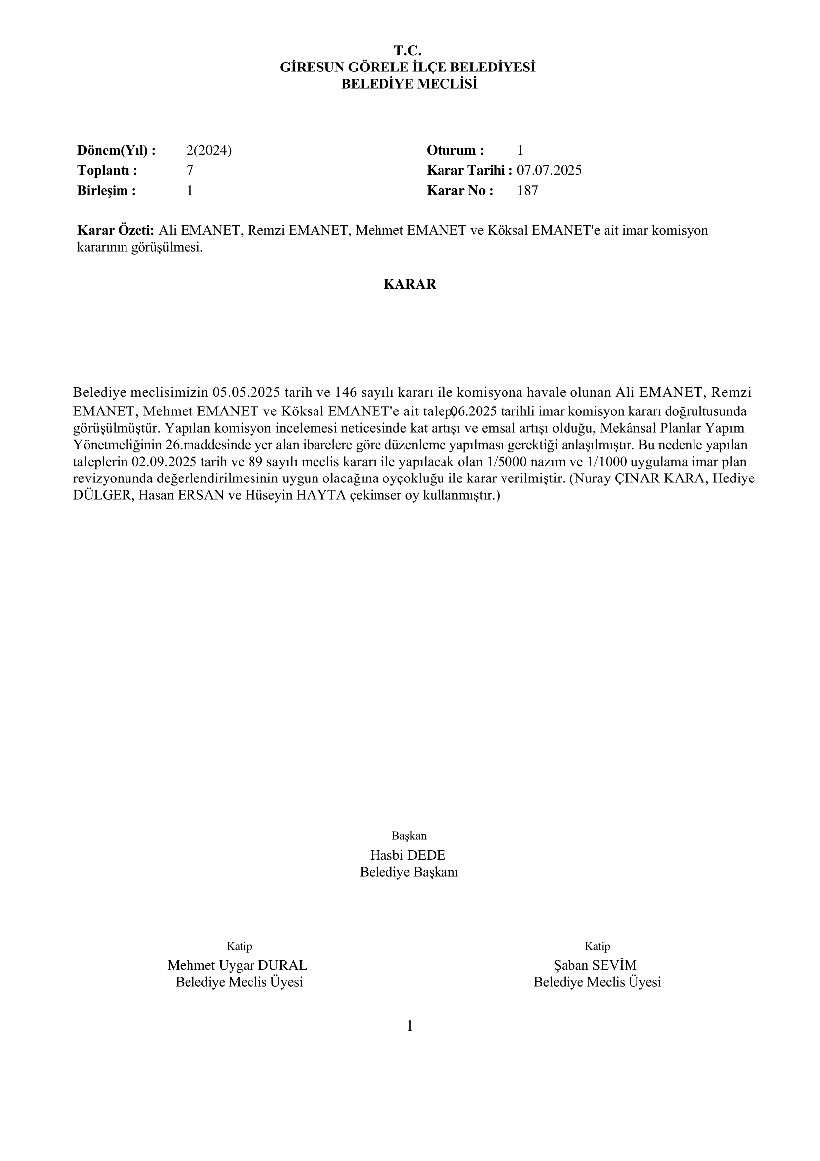 Ali EMANET, Remzi EMANET, Mehmet EMANET ve Köksal EMANET’e ait imar komisyon kararının görüşülmesi.