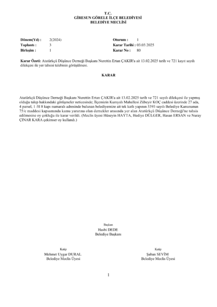 Atatürkçü Düşünce Derneği Başkanı Nurettin Ertan ÇAKIR’a ait 13.02.2025 tarih ve 721 kayıt sayılı dilekçesi ile yer tahsisi talebinin görüşülmesi