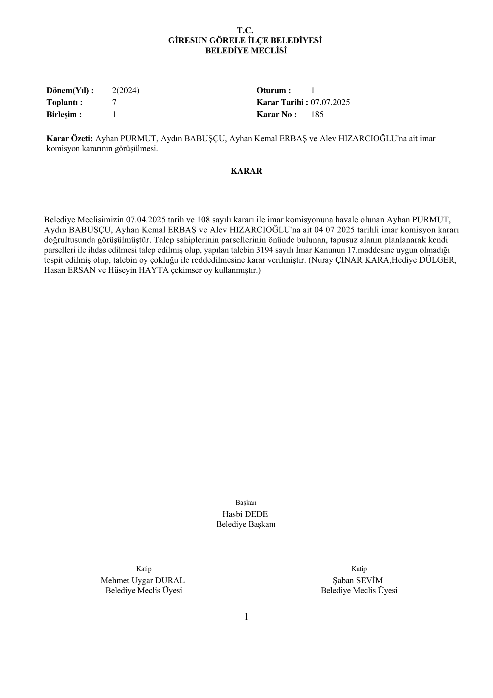 Ayhan PURMUT, Aydın BABUŞÇU, Ayhan Kemal ERBAŞ ve Alev HIZARCIOĞLU’na ait imar komisyon kararının görüşülmesi.