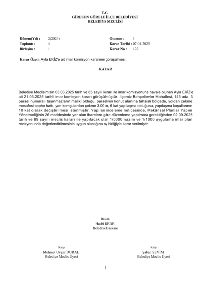 Ayla EKİZ’e ait imar komisyon kararının görüşülmesi.