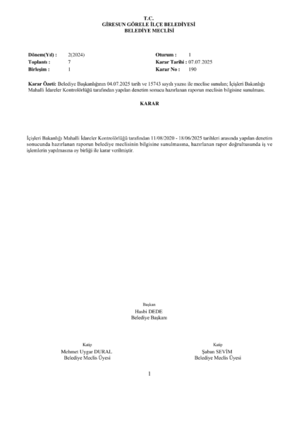 Belediye Başkanlığının 04.07.2025 tarih ve 15743 sayılı yazısı ile meclise sunulan; İçişleri Bakanlığı Mahalli İdareler Kontrolörlüğü tarafından yapılan denetim sonucu hazırlanan raporun meclisin bilgisine sunulması