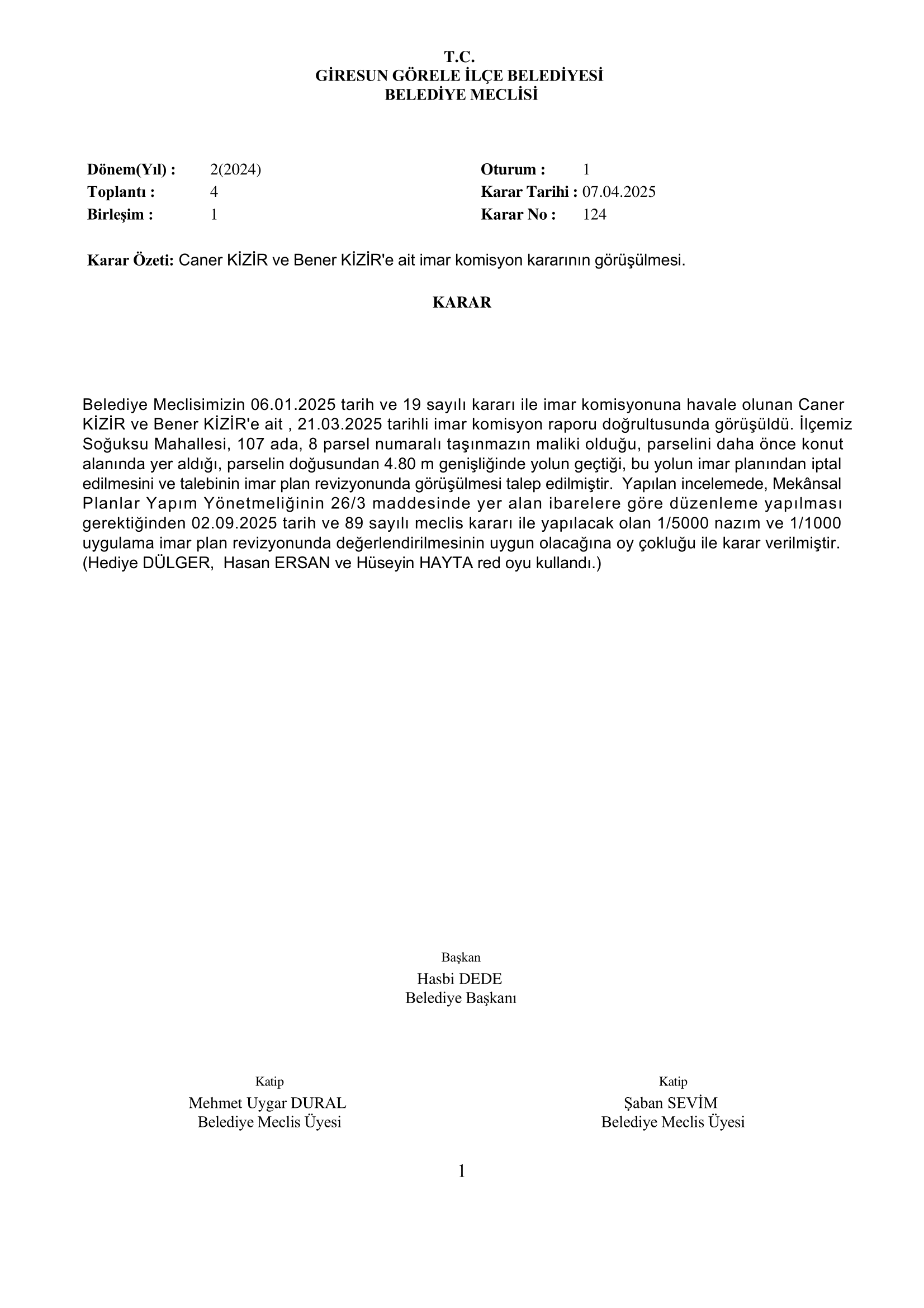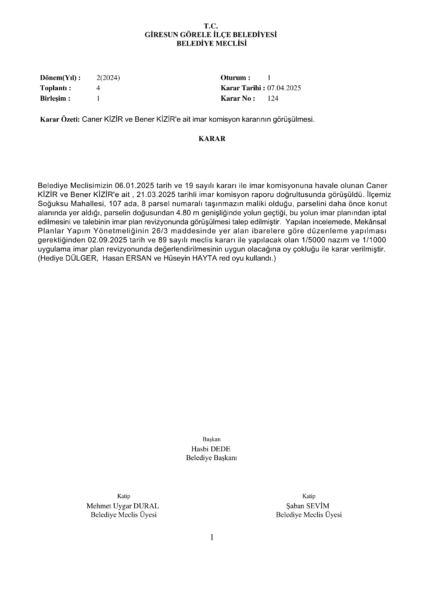 Caner KİZİR ve Bener KİZİR’e ait imar komisyon kararının görüşülmesi.