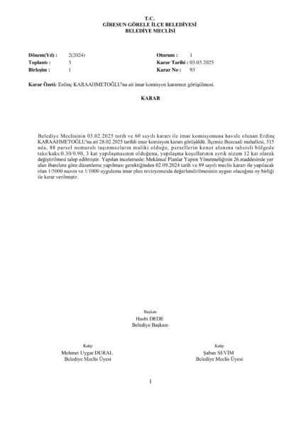 Erdinç KARAAHMETOĞLU’na ait imar komisyon kararının görüşülmesi.