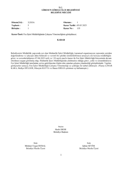 Fen İşleri Müdürlüğünün Çalışma Yönetmeliğinin görüşülmesi