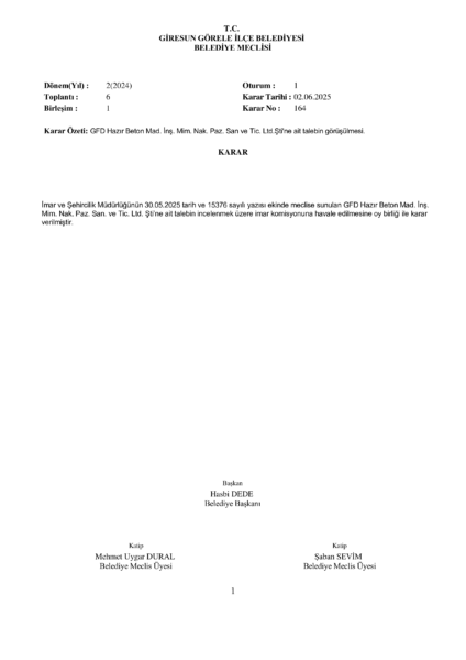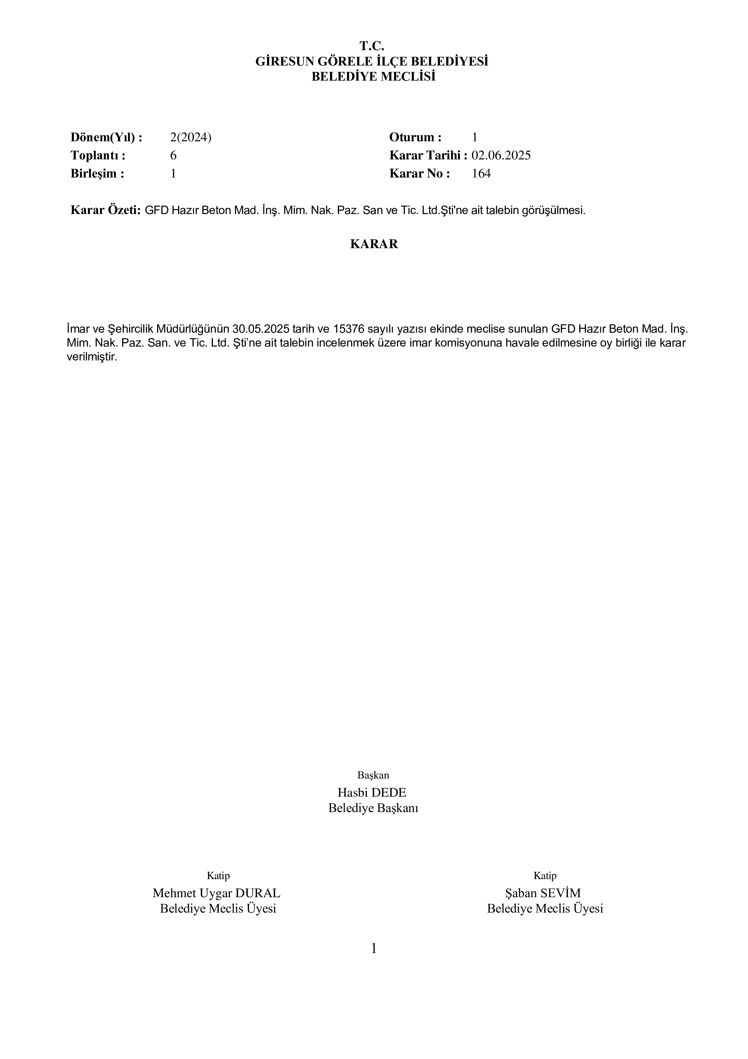 GFD Hazır Beton Mad. İnş. Mim. Nak. Paz. San ve Tic. Ltd.Şti’ne ait talebin görüşülmesi
