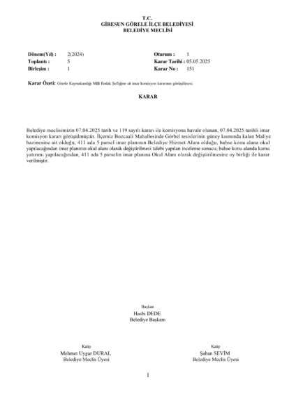 Görele Kaymakamlığı Milli Emlak Şefliğine ait imar komisyon kararının görüşülmesi