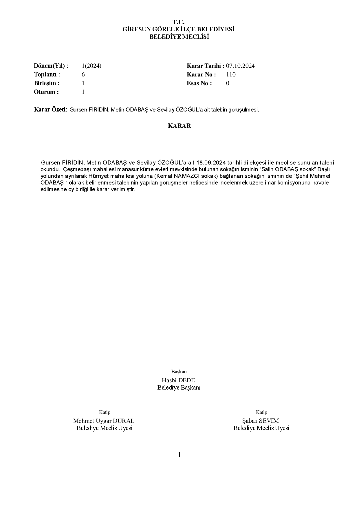 Gürsen FİRİDİN, Metin ODABAŞ ve Sevilay ÖZOĞUL’a ait talebin görüşülmesi.