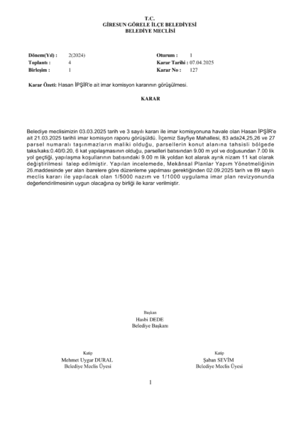 Hasan İPŞİR’e ait imar komisyon kararının görüşülmesi