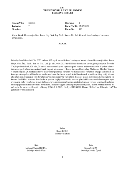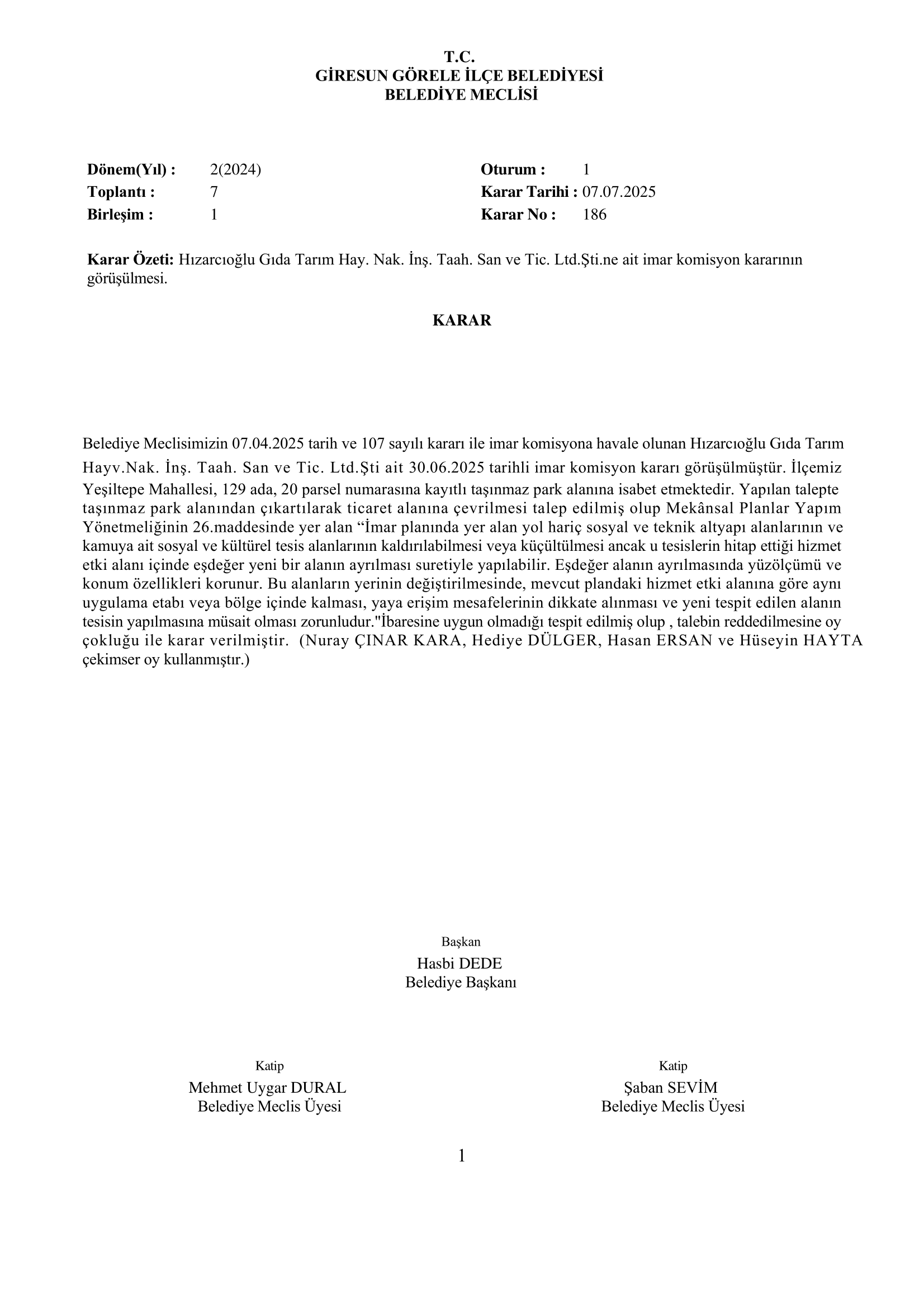 Hızarcıoğlu Gıda Tarım Hay. Nak. İnş. Taah. San ve Tic. Ltd.Şti.ne ait imar komisyon kararının görüşülmesi.