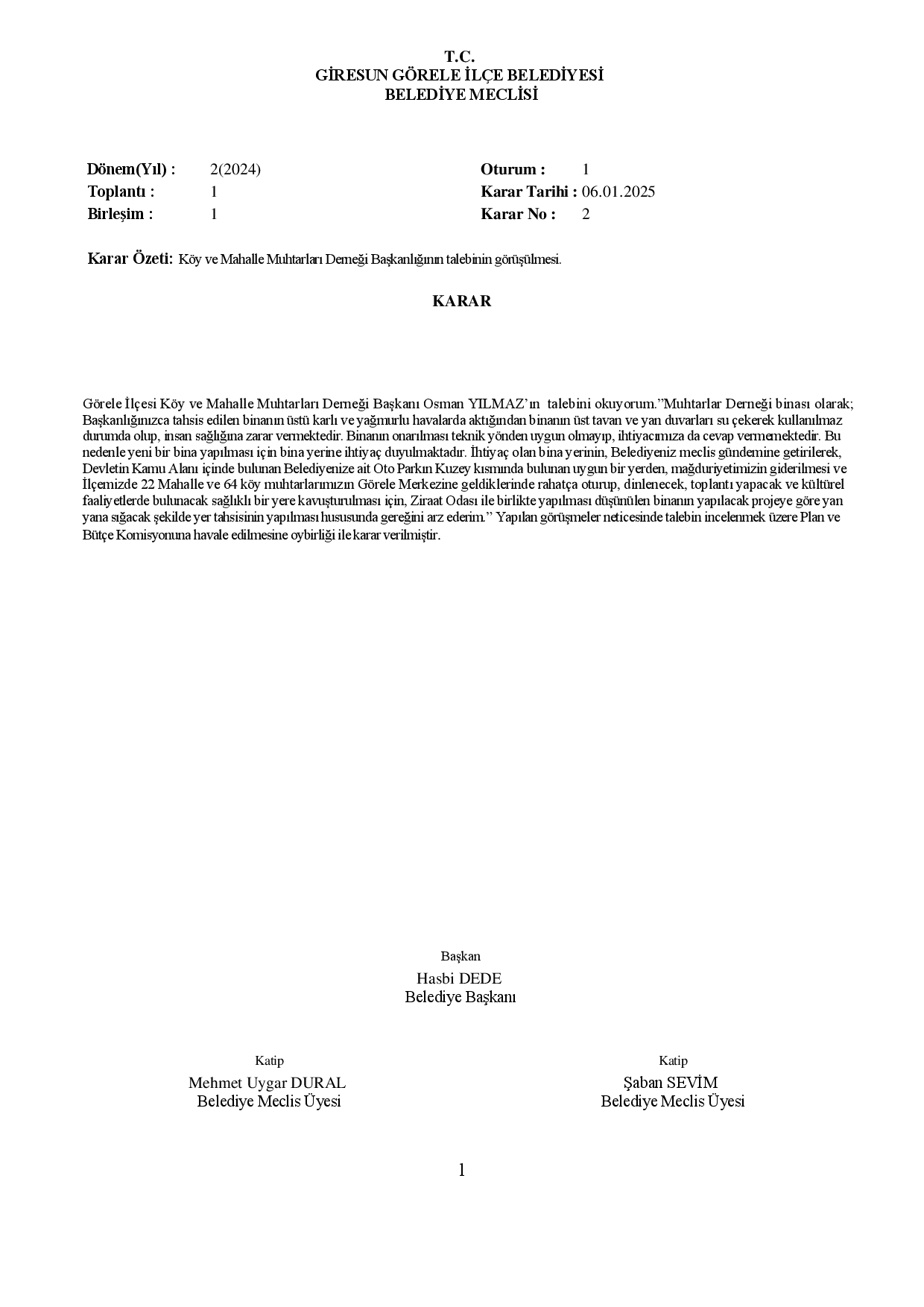 Köy ve Mahalle Muhtarları Derneği Başkanlığının talebinin görüşülmesi.