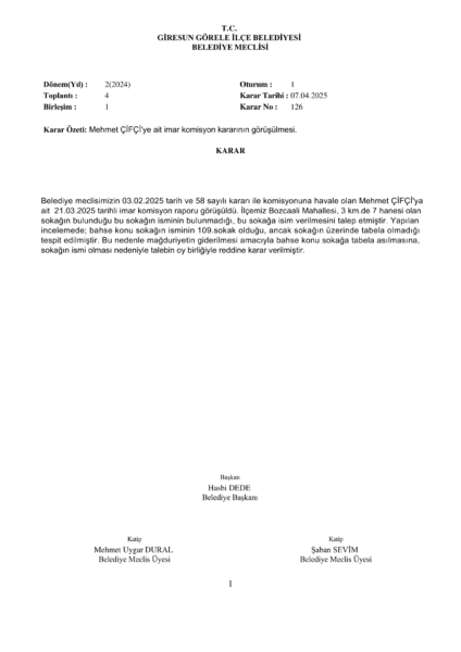 Mehmet ÇİFÇİ’ye ait imar komisyon kararının görüşülmesi
