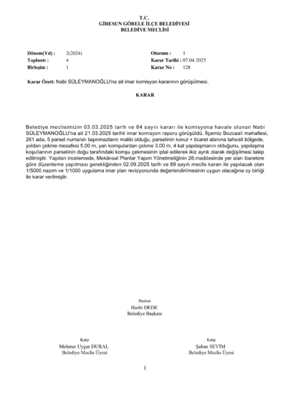 Nabi SÜLEYMANOĞLU’na ait imar komisyon kararının görüşülmesi.