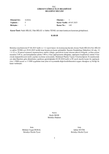 Nadir BİLGE, Fikri BİLGE ve Sabire TENK’e ait imar komisyon kararının görüşülmesi