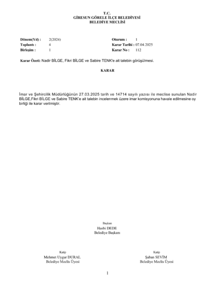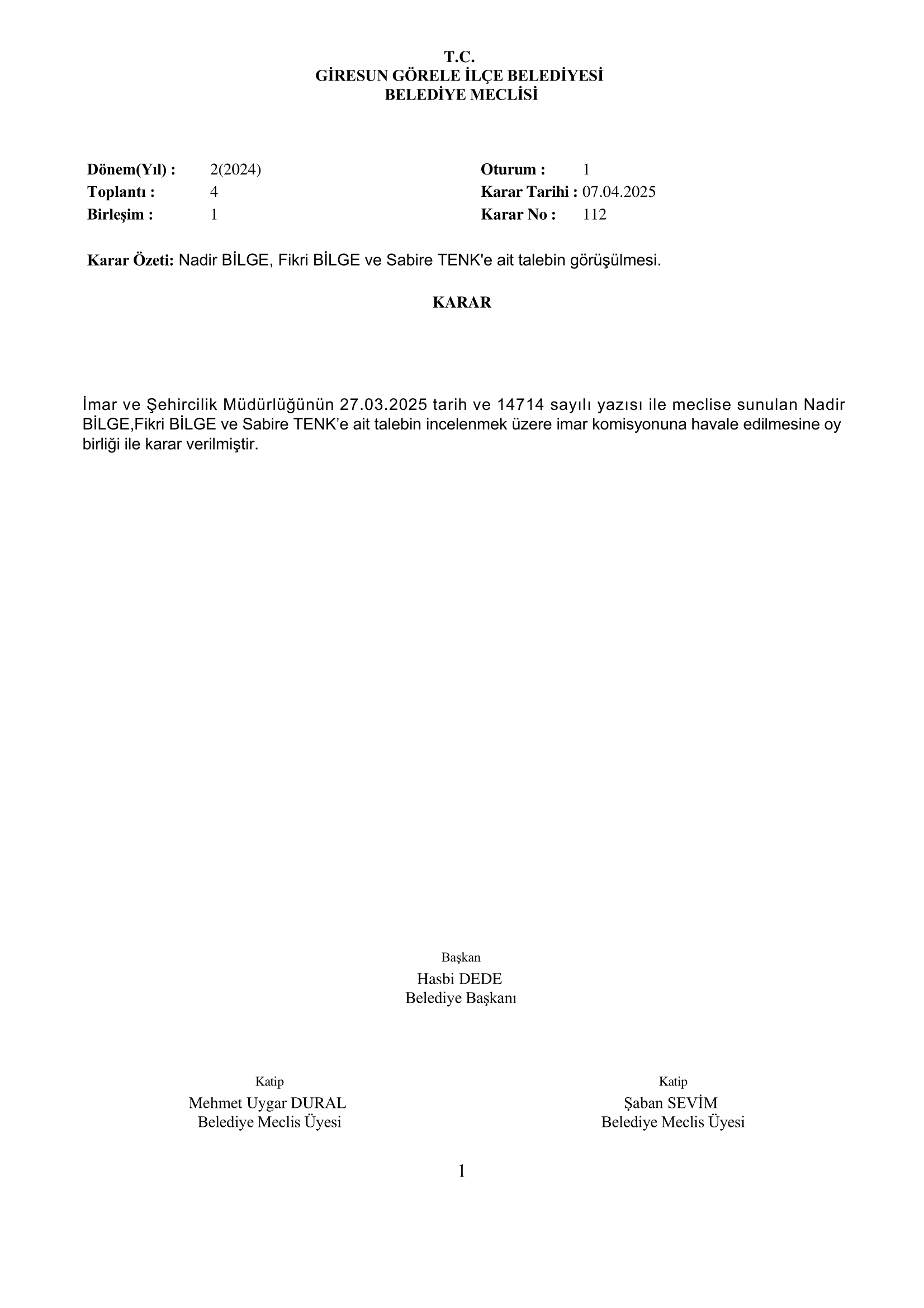 Nadir BİLGE, Fikri BİLGE ve Sabire TENK’e ait talebin görüşülmesi