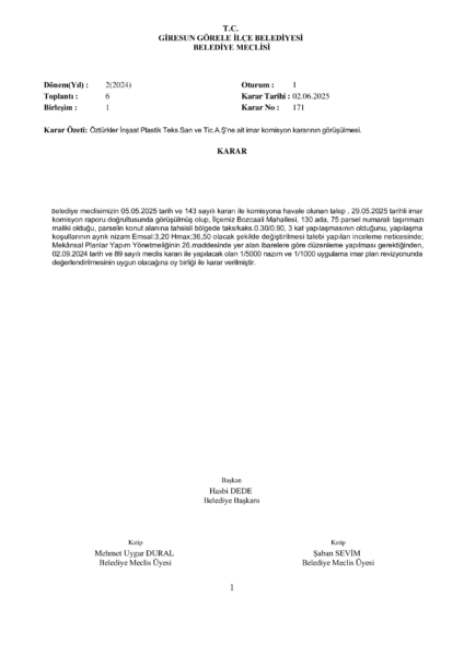Öztürkler İnşaat Plastik Teks.San ve Tic.A.Ş’ne ait imar komisyon kararının görüşülmesi