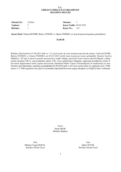 Tahsin KENDİR, Rukiye ÖNDER ve Ahmet ÖNDER’e ait imar komisyon kararının görüşülmesi