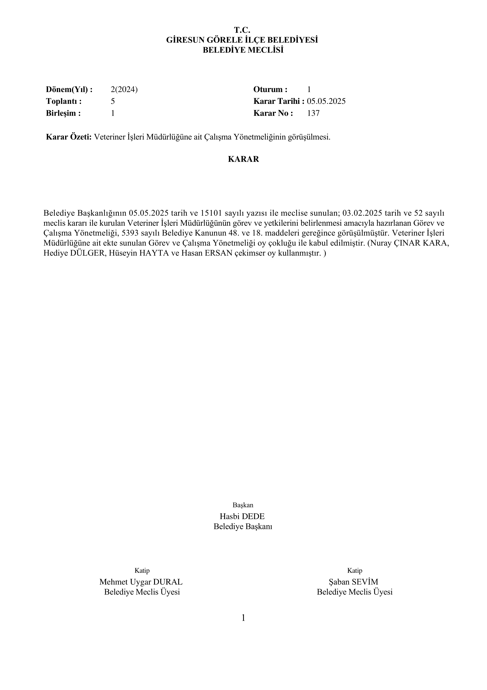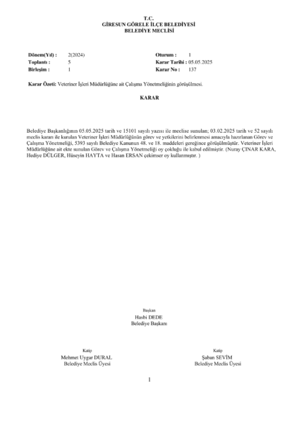 Veteriner İşleri Müdürlüğüne ait Çalışma Yönetmeliğinin görüşülmesi